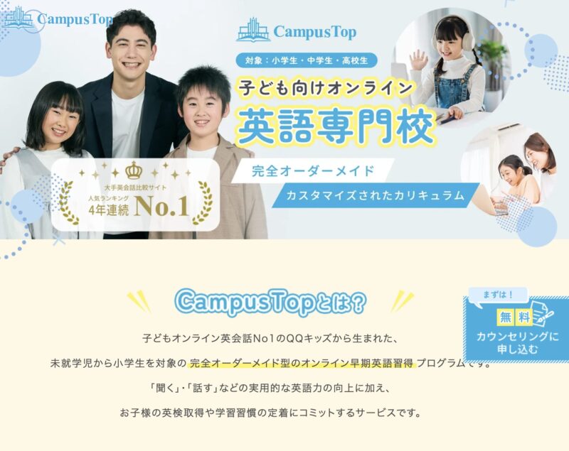 CampusTop(キャンパストップ)は、QQ Englishが提供する小学生向けオンライン英語プログラムです。口コミでは「料金が高い」という声もありますが、専属日本人コーチによる伴走サポートや、TESOL資格を持つ講師のマンツーマン指導で成果を出せると高く評価されています。